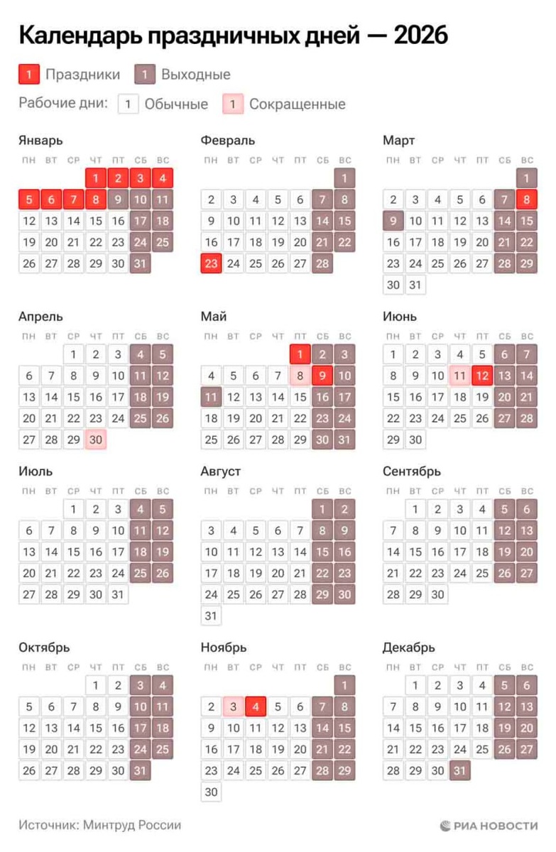 🔻Производственный календарь-2026: россиян ждут шесть длинных выходных и длинные новогодние каникулы