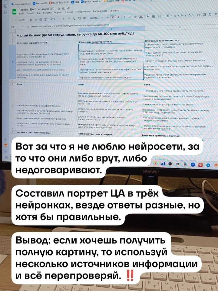 Сейчас я пересобираю свой проект, потому что давно вырос из проектов, где нужна только лидогенерация. Планирую заниматься консалтингом по продажам и маркетингу, ибо меня к этому тянет и результаты в этом направлении меня сильно радуют. Пришлось переупаковать проект: собрать линейку продуктов; прописать воронку продаж; концепцию проекта; контент-план. Немаленький такой объём работы получился. Это я ещё не начал собирать лендинги под продукты, их минимум три штуки надо, а это тоже время. Долго сопротивлялся нейросетям, хотел делать всё вручную, но без ИИ, увы, сложно. Правда и без подводных камней не обошлось. Например, мне нужно было составить портреты ЦА в сегментах малого и среднего бизнесов. Я пошёл в Deep Seek, потом к Алисе, а на сладкое оставил Perplexity. Все три нейронки дали мне разные ответы, они вообще не совпадали. К моему счастью, вся информация оказалась правильной и получилось так, что у меня есть более полная картина по целевой аудитории. Как говорится: «На ИИ надейся,