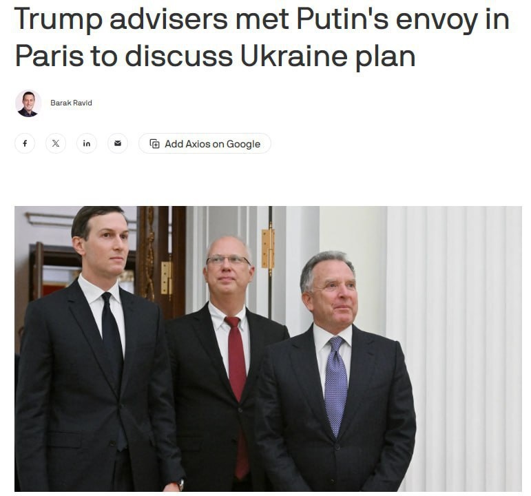Спецпредставители президента США Стив Уиткофф и Джаред Кушнер передали представителю Путина на переговорах с США Кириллу Дмитриеву