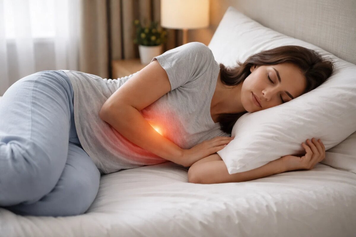Положение на правом боку тоже не так безобидно, как кажется. Анатомически желудок расположен так, что при лежании на правой стороне его содержимое легче смещается к выходу в пищевод. У людей с чувствительным желудком это нередко усиливает чувство жжения и тяжести. Многие замечали: перевернулся направо — стало хуже. Это не совпадение, а геометрия внутренних органов.