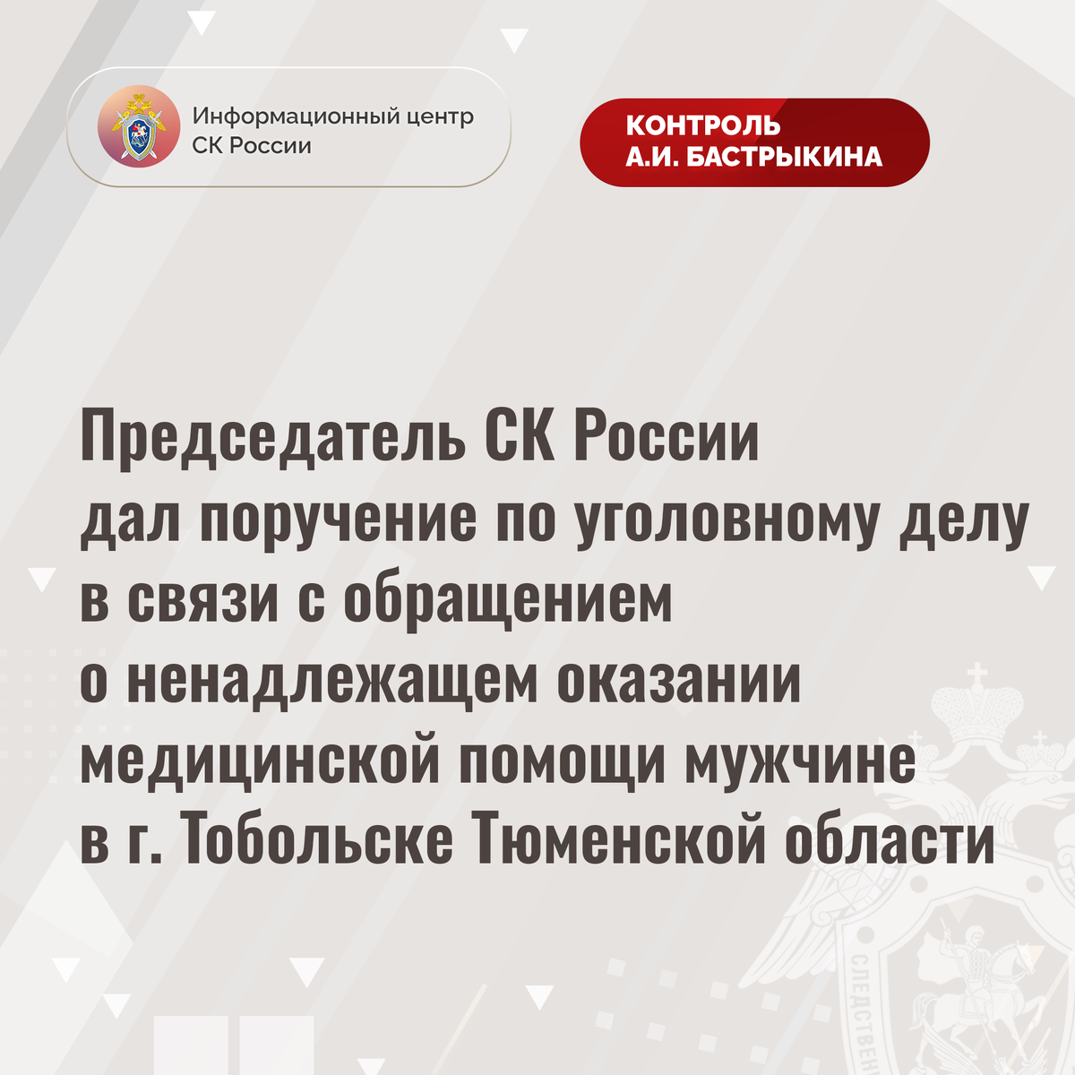 Председатель СК России дал поручение по уголовному делу в связи с обращением о ненадлежащем оказании медицинской помощи мужчине в г. Тобольске Тюменской области К Председателю СК России А.И. Бастрыкину через Информационный центр поступило обращение по вопросу несогласия с ходом установления обстоятельств смерти мужчины в результате оказания ему ненадлежащей медицинской помощи в одной из больниц в городе Тобольске Тюменской области. В 2024 году пациент с травмами госпитализирован, однако необходимая помощь ему не оказывалась. Спустя несколько дней мужчина скончался. Отмечается затяжной характер расследования уголовного дела, до настоящего времени никто к ответственности не привлечен. В СУ СК России по Тюменской области с января прошлого года расследуется уголовное дело. Председатель Следственного комитета Российской Федерации Александр Иванович Бастрыкин поручил руководителю СУ СК России по Тюменской области Александру Александровичу Кублякову принять меры к завершению расследования уг
