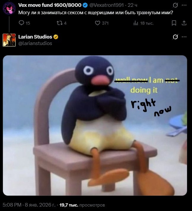 ⚡️В Divinity можно будет заняться сексом с ящерами подтвердили разработчики. Один из фанатов поинтересовался у Larian Studios, появится ли такая возможность в игре в ответ он получил мем с текстом «Я занимаюсь этим прямо сейчас». Игра года? CtrlAltDelights- подписаться