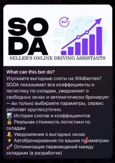 Мой хороший друг - Александр, запустил бота в помощь селлрам на ВБ. Что уже есть? 1) Очень удобная аналитика коэффициентов и тайм слотов. Очень удобная для отслеживания 2) Автобронировния (срабатывание за 1.7 секунды) С эмуляцией действия человека и разными IP, что бы не спалили 3) Автоматическая проверка черновика сразу по всем складам, и пометкой конкретного товара и причины, если какой то склад не принимает 4) Настройка любого количества уведомлений по слотам 5) Перераспределение остатков (Вылавливаем квоты). Так как я уже на торгую, то ботом не пользуюсь, но Качество это базовая ценность Александра. А значит и тут все будет на уровне. @SODA_app_bot Upd: это приложение. Там вход через бота, что бы уведомления приходили, а так полноценное приложение. Upd2: всем присоединившимся сегодня, будет начисленно 10 перемещений для теста.
