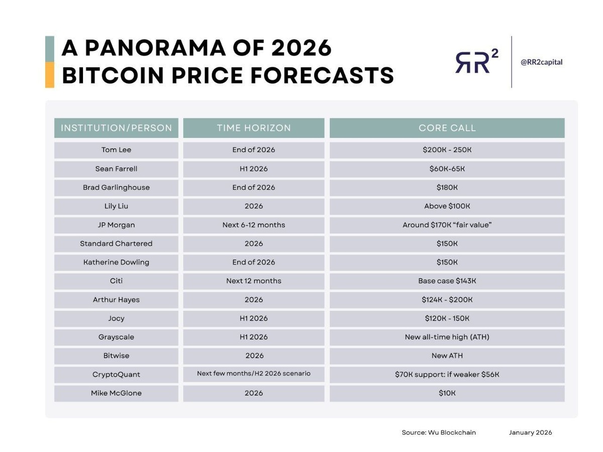 Быки: ⚪️Том Ли: $200 000-$250 000 ⚪️Брэд Гарлингхаус (Ripple): $180 000 ⚪️JP Morgan: $170 000 ⚪️Standard Chartered / Citi: $150 000 ⚪️Артур Хейс: $124 000-$200 000 ⚪️Grayscale / Bitwise: скромно ждут новый ATH Медведи: 🔴Шон Фаррелл (Fundstrat): просадка до $60 000-$65 000 в H1 🔴CryptoQuant: поддержка на $70 000 (или $56 000 в слабом сценарии) 🔴Майк МакГлоун: $10 000