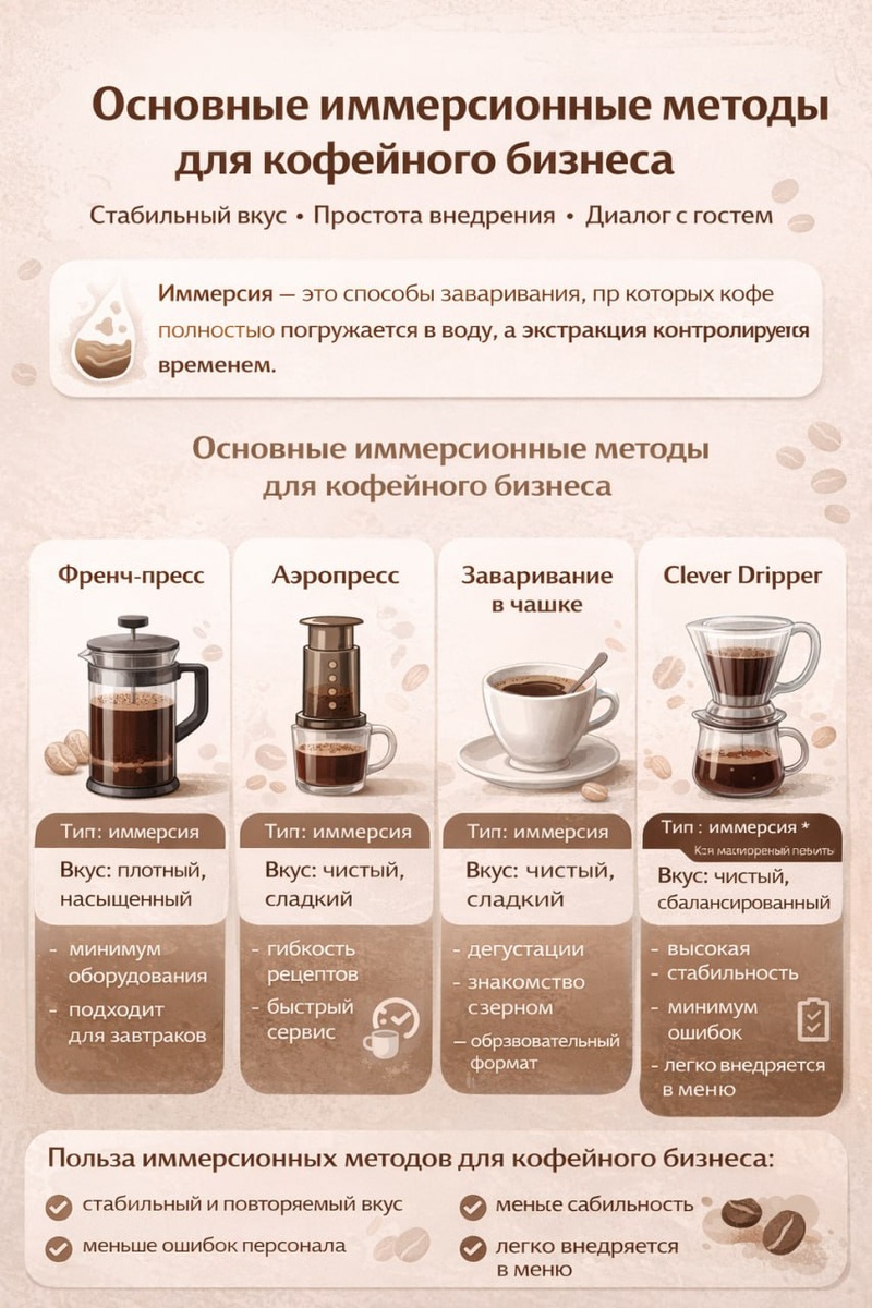 Нас часто знают как место, где можно выбрать и посмотреть профессиональные кофемашины. Но кофейня — это всегда больше, чем эспрессо. В «Территории Кофе» мы работаем со всем кофейным оборудованием, которое реально влияет на вкус, меню и экономику кофейни. И сегодня хотим поговорить про ручные альтернативные способы заваривания, а именно — иммерсионные методы. Что такое иммерсионные методы заваривания Иммерсия — это способ приготовления, при котором молотый кофе полностью погружается в воду, а экстракция контролируется временем, а не проливом. Это одни из самых стабильных и понятных методов, которые отлично подходят именно для кофейни, а не только для дома. Основные иммерсионные методы для кофейного бизнеса ☕️ Френч-пресс ▫️Простой и понятный метод с ▫️▫️плотным телом напитка. Хорошо работает для: ▫️завтраков ▫️кофе «к графину» ▫️спокойного, неспешного формата Плюс для кофейни — минимум оборудования и обучения. ☕️ Аэропресс (в иммерсионной логике) Гибкий и универсальный метод.