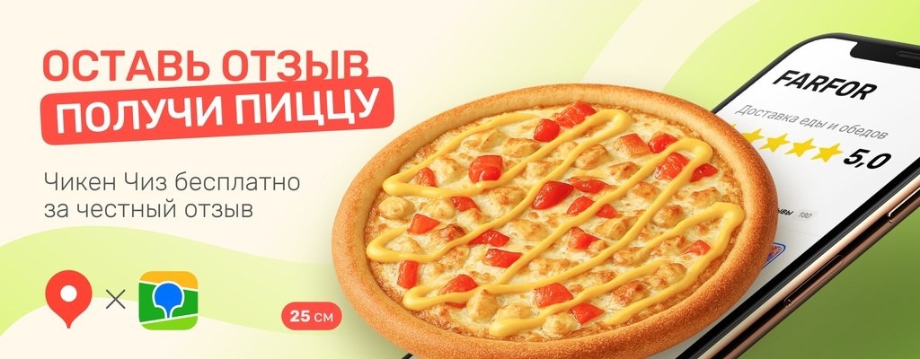 🥘 Оставь отзыв — получи пиццу! Мы любим читать ваши отзывы, а за честные слова — дарим вкусное! Напиши пару слов о своём заказе и получи пиццу «Чикен Чиз» 25 см в подарок. Как это работает: Оформи заказ через сайт / приложение / оператора. Оставь отзыв о нас на Яндекс.Картах или 2ГИС и обязательно укажи номер своего заказа в отзыве. Сервис сам определит ваш город, а если нет — выберите его вручную, чтобы отзыв попал в нужную карточку. После проверки заказа мы отправим подарок в твой личный кабинет. 📶 Категория: Ресторан 🏢 Место: Доставка еды "FARFOR" 📍Адрес: г. Подольск, микрорайон Климовск, Садовая ул., 4Б ⏱ Часы работы: Пн - Чт: 11:00 – 22:30 Пт - Вс: 11:00 – 23:00 ✅ Где поесть, Подольск!? https://dzen.ru/id/6756016c107ef731969e16a5 https://vk.com/gde_poest_podolsk https://dzen.ru/gde_poest_v_podolske