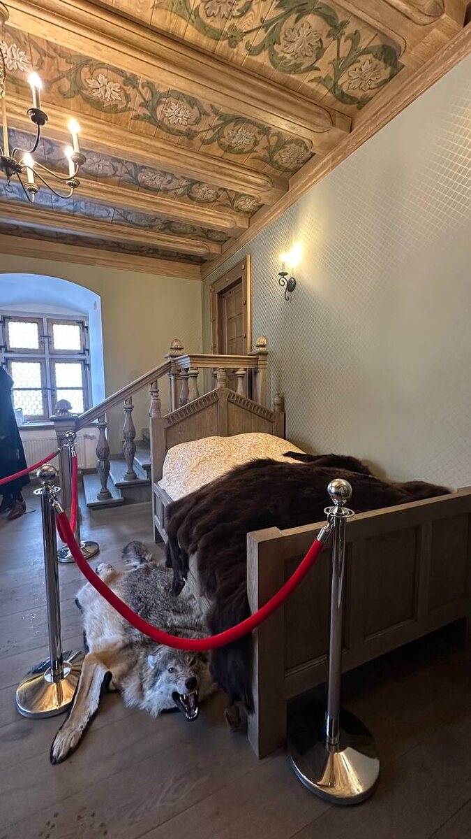 Квартиры и быт очень похожи с Россией (советские серии + новостройки), поэтому «вау-контрастов» нет. А вот посмотрели и впечатлил единственный сохранившийся королевский Старый замок в Гродно. Встречающие мех, волк на полу — музейно-театрально, но работает: сразу чувствуешь время, когда текстиль и шкуры были не «декором», а нормой быта и статуса. Зелёная печь (пусть и новодел) с изразцами (тут их называют «кафля», т. е. «кафель», пришёл из немецкого Kachel) и медные сосуды, купель — прямо интерьерный центр, показывающий, что не малое внимание уделялось гигиене. Деревянные панели, расписные кессоны, лепнина — все это тоже про то, как и «тогда» делали уют. Особенности квартир в разных странах #выходныесдизайнером