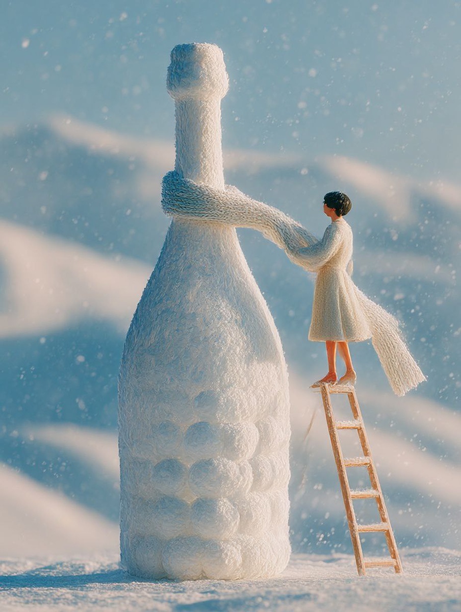 A giant champagne bottle sculpture stands upright in the snow, entirely constructed from perfectly round snowballs stacked vertically wide base, narrowing body, long elegant neck forming a clear champagne bottle silhouette. The sculpture is made only of snow, with no glass, no labels, no non-snow materials. A chic, elegant woman stands on a ladder beside the sculpture, in the act of tying a giant wool scarf around the neck of the bottle-shaped snow sculpture, as if dressing an oversized snowman. The scarf is thick, soft, oversized, and clearly made of knitted wool, dramatically larger than a normal scarf. Snow gently falls around her as she works. The woman wears refined winter clothing, contrasting with the playful scale of the scene. Minimalist environment, endless white snow, no buildings or distractions. Soft winter daylight, poetic and whimsical mood, luxury advertising aesthetic, high detail, clean composition, cinematic depth of field, strong sense of scale and imagination. --ch