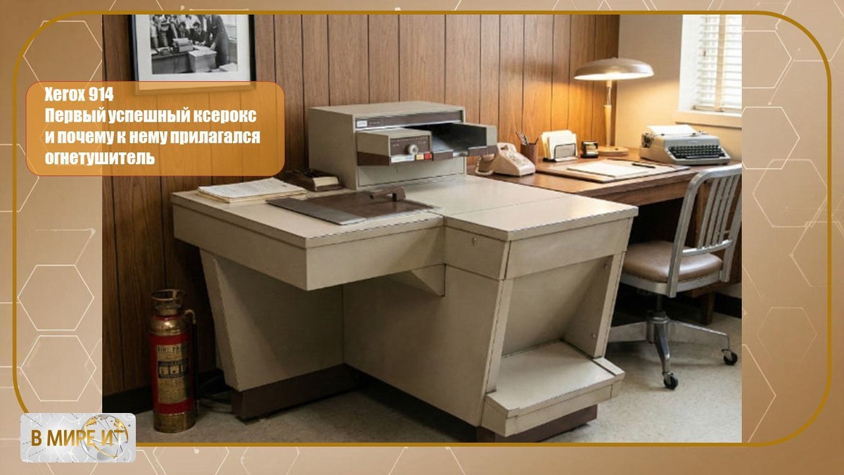 В 1959 году появился Xerox 914 - первый по‑настоящему коммерчески успешный копир для обычной бумаги, который превратил офисы из хранилищ копирки и кальки в мир быстрых копий «по щелчку». Аппарат весил около 650 фунтов, занимал полкомнаты и делал до 7 копий в минуту, что по меркам конца 50‑х выглядело практической магией и немедленно вывело Haloid/Xerox в лидеры копировальной революции. Но у чуда техники был демонический характер: 914 любил перегреваться и при интенсивной работе иногда загорался, поэтому вместе с ним официально выдавали фирменный огнетушитель под ироничным названием «scorch eliminator» - «ликвидатор ожогов». Эта странная смесь гениального прорыва и потенциального костра не помешала модели 914 стать легендой и сделать глагол «ксерить» частью повседневной речи по всему миру. #вмиреит #технологии #история