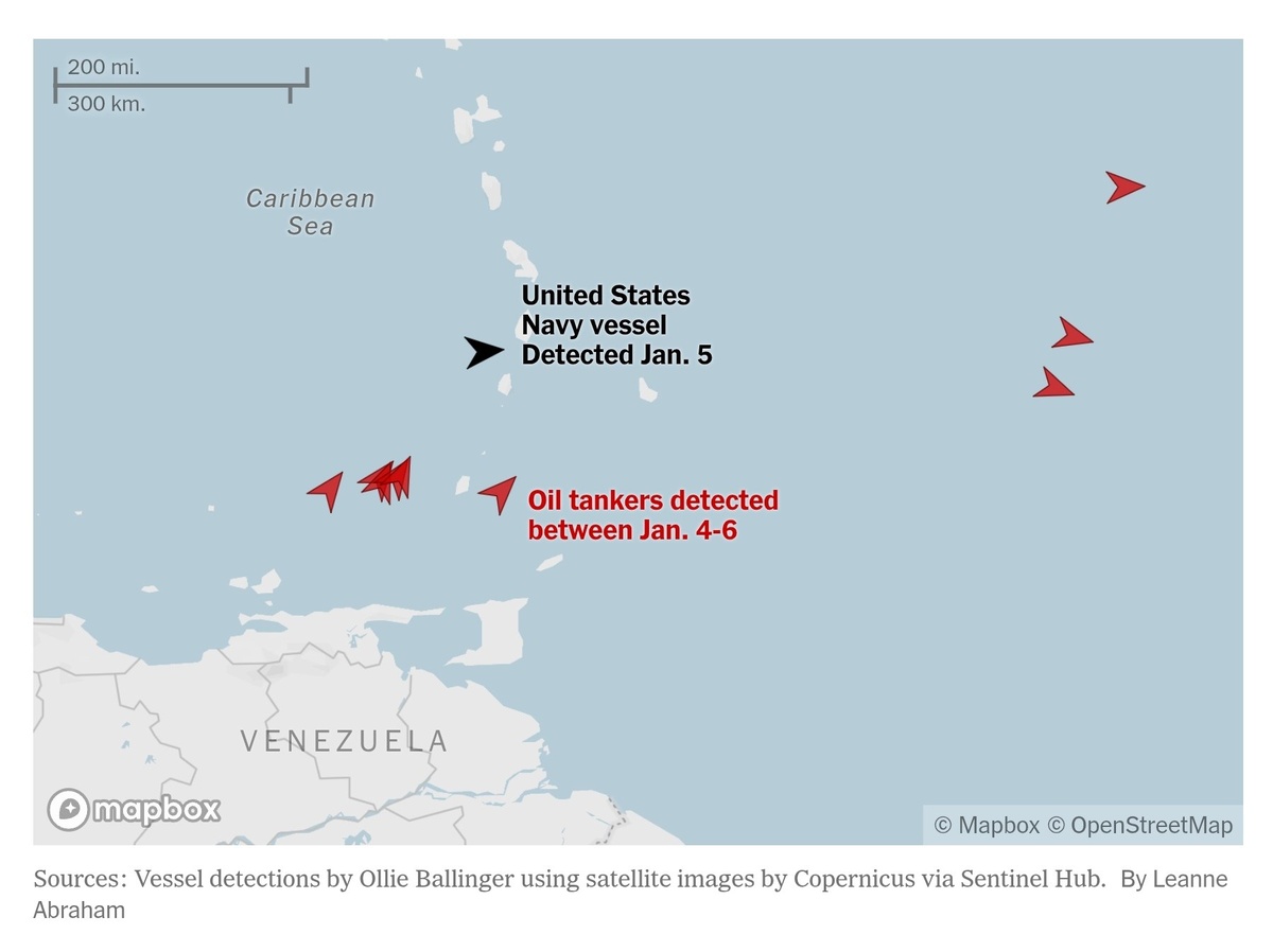 США в настоящее время ведут преследование ещё нескольких танкеров, перевозящих венесуэльскую нефть, сообщает NYT. 11 декабря, вскоре после захвата первого танкера Skipper, была опубликована информация о существовании определённого списка венесуэльских танкеров, чей захват планируется вооружёнными силами США. Перечень судов в списке остаётся неизвестным. Суда, которые сейчас пересекают Атлантический океан, входят в состав крупной группы танкеров из 16 судов, которые предприняли, вероятно, скоординированную попытку прорыва блокаду, массово покинув венесуэльские воды. Из этой группы было задержано только одно судно – M/T Sophia. Из оставшихся 15 танкеров четыре направляются на восток в Атлантическом океане. Вторая группа из пяти судов была замечена в понедельник идущей на северо-восток через Карибское море. В тот же день было сделано фото эсминца ВМС США, который направлялся к танкерам, пересекающим Атлантику. По данным ресурса TankerTrackers, один танкер вновь появился у берегов Колу