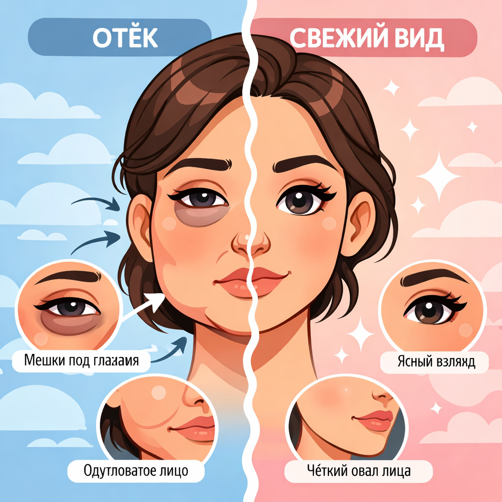 Припухлость под глазами, размытый овал лица, тяжелые щеки и ощущение, будто лицо стало больше, чем обычно. Иногда утром отражение в зеркале кажется совсем не вашим – это и есть отек. Важно понимать: отеки – это не про плохой уход или возраст, а про процессы внутри организма. Причин может быть сразу несколько. Самая частая – нарушение оттока лимфы и венозной крови. К этому добавляются недосып, хронический стресс, избыток соли и алкоголя, гормональные колебания. Сидячая работа, малоподвижный образ жизни и привычка спать лицом в подушку тоже играют роль. У некоторых людей есть генетическая склонность к задержке жидкости – и это вариант нормы, а не проблема кожи. Первое – наладить питьевой режим. Парадоксально, но недостаток воды усиливает отеки. Второе – сократить количество соленой пищи, особенно вечером. Полноценный сон, смена положения тела в течение дня и умеренная физическая активность помогают лимфе двигаться активнее. Дополнительно можно использовать холодные компрессы и легкий лим