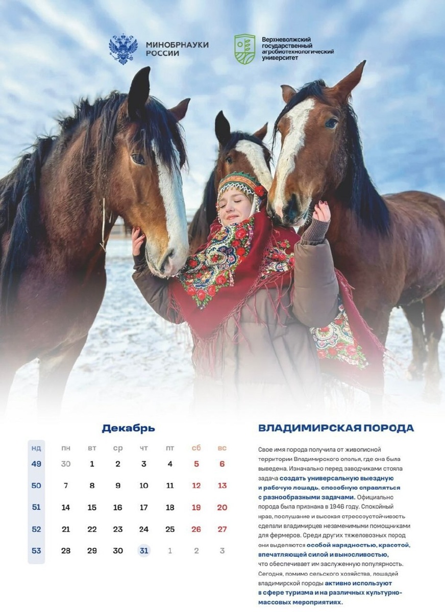 В своих соцсетях ивановский агробиотех рассказал, что их университет был представлен в календаре Минобрнауки на 2026 год. Каждая страница месяца в нем рассказывает о какой-то отечественной породе лошадей, истории ее выведения и особенностях. Месяц декабрь в календаре украшен фотографией ивановской студентки агробиотеха Виктории Разбегаевой и знаменитыми владимирскими тяжеловозами. Как указано в календаре, среди других тяжеловозных пород владимирские выделяются «особой нарядностью, красотой, впечатляющей силой и выносливостью. Сегодня, помимо сельского хозяйства, лошадей владимирской породы активно используют в сфере туризма на различных культурно-массовых мероприятиях». Заметим, что декабрьская страничка — единственная, где помимо лошадей на фото запечатлен человек. Фото: соцсети Верхневолжского ГАУ