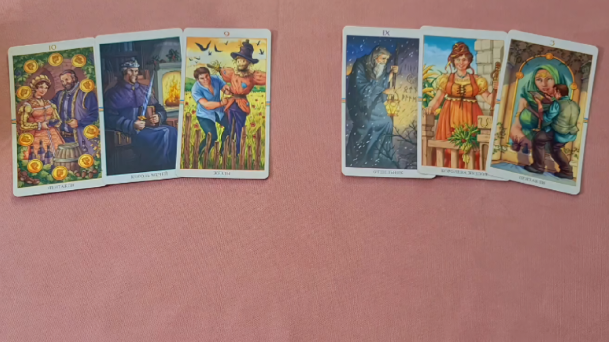 Так давайте посмотрим: что же между вами и этим Королём Мечей? Почему вы одиноки, несмотря на его интерес? Потому что, девочки, у нас здесь получается не пара, а почти четырёхугольник. Люди — каждый сам по себе. У вас, возможно, есть отношения — вы играете их, вы вместе в каких-то моментах, вы — пара на бумаге или в глазах других. Но в реальности — Четвёрка Пентаклей: у каждого своя жизнь, свои стены, свои страхи. Вы тянетесь друг к другу, думаете друг о друге, и даже чувствуете — Десятка Чаш рядом! Там есть любовь, есть желание быть вместе, есть мечта о счастье, о том самом доме, полном смеха и света.