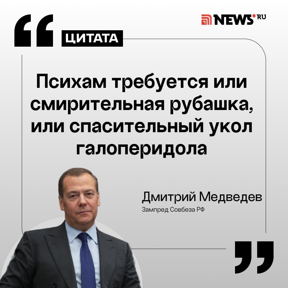 Медведев назвал удар «Орешником» по Украине «уколом галоперидола опасным психам». Зампред Совбеза РФ подвел итоги первых дней 2026 года: 🟤Американские элиты должны признать правомерность действий России в ходе СВО после устроенного США в Венесуэле; 🟤Похищение Мадуро — «хамство и мерзость», а международные отношения превратились в «форменный бедлам»; 🟤Санкционная политика США в отношении России продолжится при любой погоде, но Россия все выстоит; 🟤Россию с помощью санкций будут склонять к абсолютно неприемлемым компромиссам по гарантиям безопасности и территориям. ⭕️ Подписаться | Мы в MAX | Буст