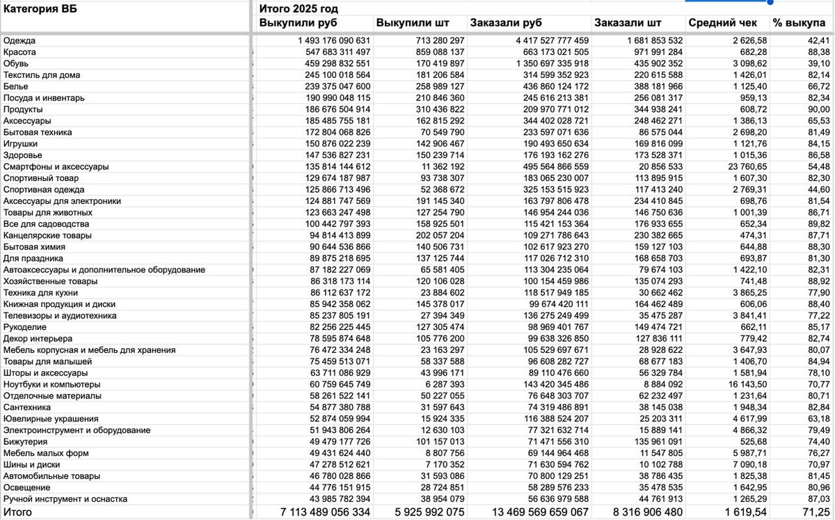 )) Собрал статистику по вб за 2025 год Оборот ВБ за 2025 год составил 7,1 трлн В 2024 году оборот у них был 4,1 трлн рост 73% Квартиру за 11 млн купленную на ВБ что-то я не нашел По автомобилям тоже какая-то странная ситуация, заказы есть, а выкупов 0.7% (Да да, меньше 1% выкуп) Оказывается ВБ еще и Золотыми слитками торгует, я вот карточку на площадке найти не смог, если видели скиньте посмотреть. 637 тыс пластиковых карт ВБ банка через ПВЗ доставили Средний процент выкупа по площадке 71% Средний чек 1619 руб Вот таблица с данными по всем категориям и предметам: https://docs.google.com/spreadsheets/d/16LtA3M-gYaDtj3SXTd9rd-3Mxmpv1xBFxelhOK5tq0M/edit?gid=1914303592#gid=1914303592 Можете проанализировать по своим и смежным категориям, как менялся процент выкупа в течении года и как менялся средний чек после повышения комиссий (где-то рос, а где-то наоборот падал…) Делитесь в комментариях кто что интересного найдет