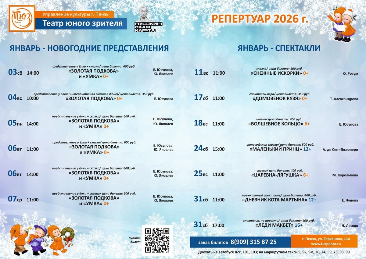 🎭 Уважаемые зрители! Пензенский ТЮЗ ждёт вас в январе! 🎟 Билеты можно приобрести перед началом показа в кассе, по ссылке на сайте Пензенского ТЮЗа tuzpenza.ru/ или по ссылке: tickets.afisha.ru/wl/484/api... ❗Из-за проблем с интернетом электронные билеты необходимо распечатывать или сохранять скриншот. 💳 Большинство спектаклей участвует в программе «Пушкинская карта». 🧾 Цена билетов - 350 - 600 рублей. 👶 Дети до 3-х лет смотрят спектакль бесплатно (только при предъявлении свидетельства о рождении). ☎ Телефон для справок: 8(909) 315-87-25. (☝Если решение пойти в театр пришло в последний момент, перед выходом уточняйте наличие билетов по телефону). Читайте нас в телеграме: t.me/PenzaTYZ #ПензенскийТЮЗ #новости_культуры58 #афиша_культура58 #penza_kult