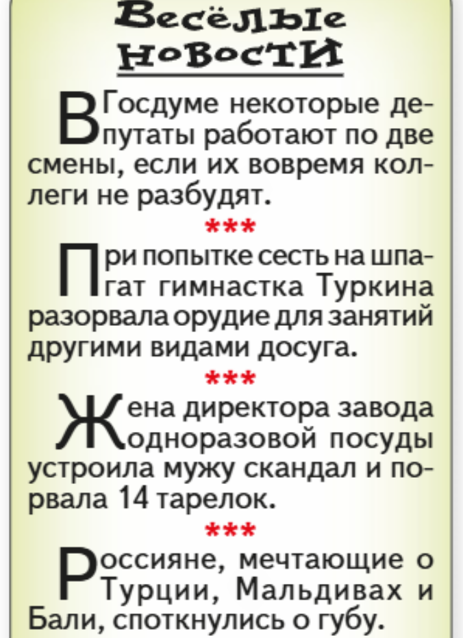 Всем мира и добра! Мир чтоб был абсолютный, а не худой, а добро, ну а добро пусть будет с кулаками. Тут я согласен с великим Ножкиным. Недавно вызвал "скорую" для тёщеньки, поплохело ей. Явились двое: девушка и мужчина, у одной была русая шикарная коса, как у снегурочки, коса была искусственной, это я понял потому, что она (коса) была приколота к докторской шапочке девушки, причём спереди, у мужика был нос красно-синий, как у деда Мороза, а вместо сумки, через плечо висел мешок с приклеенными снежинками. Они поздравили всех нас с Новым годом, поднесли к тёщиному рту зеркальце и сказали: - Всё в порядке, до свидания! Я говорю: -Уже уходите? Так скоро?! - Но мы же "скорая", говорят они. И ушли. А тёща жалобно попросила меня: -Зятёк, накапай мне. - Карвалола? -Водки! Да не жалей! А летом случай был. Иду по парку, девушка сидит на лавочке, курит. И тут, ну, я близко к ней проходил, я вижу, что у неё одна ти...ка из блузки вывалилась. А девушка сидит и невозмутимо к