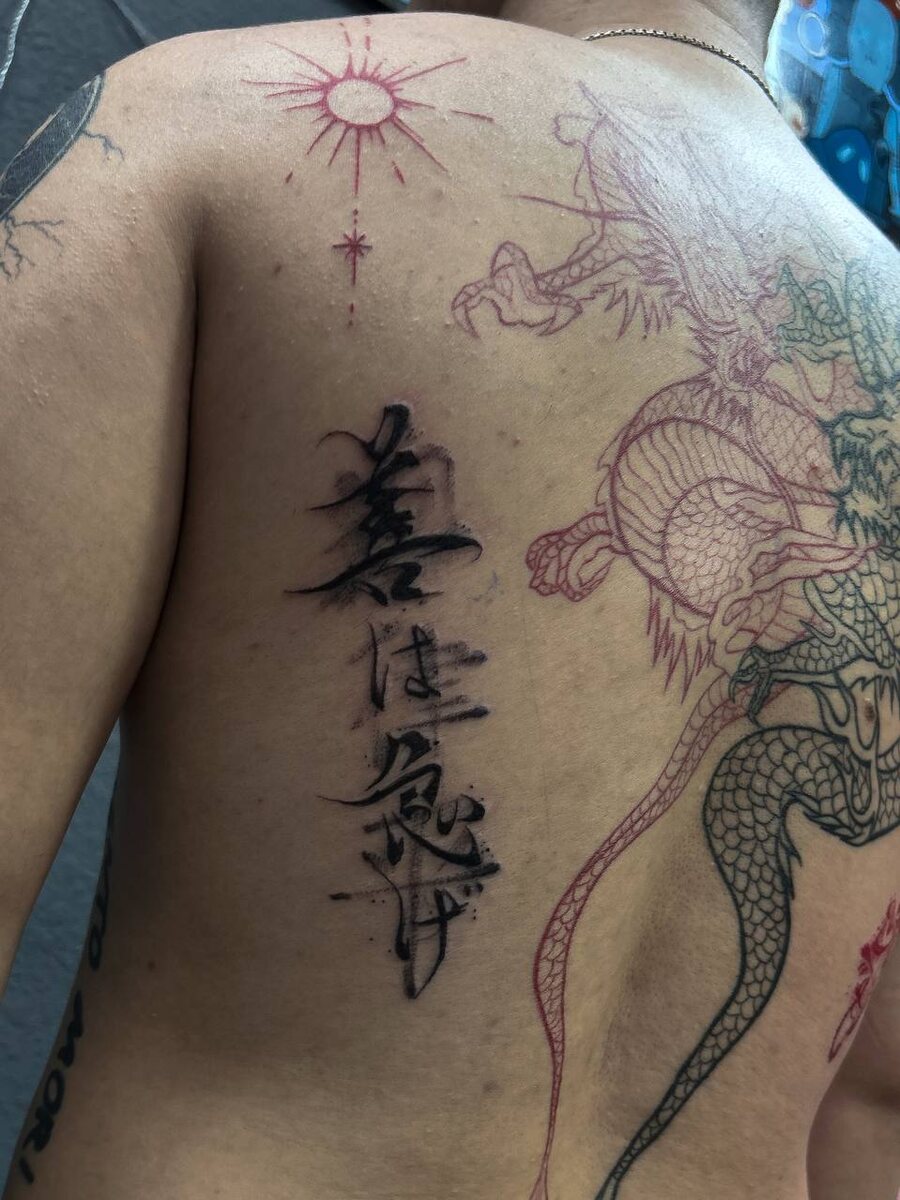 Парень пришел с девушкой на парные татуировки, но мы решили что ему не хватает иероглифов и дополнили спину симметрией