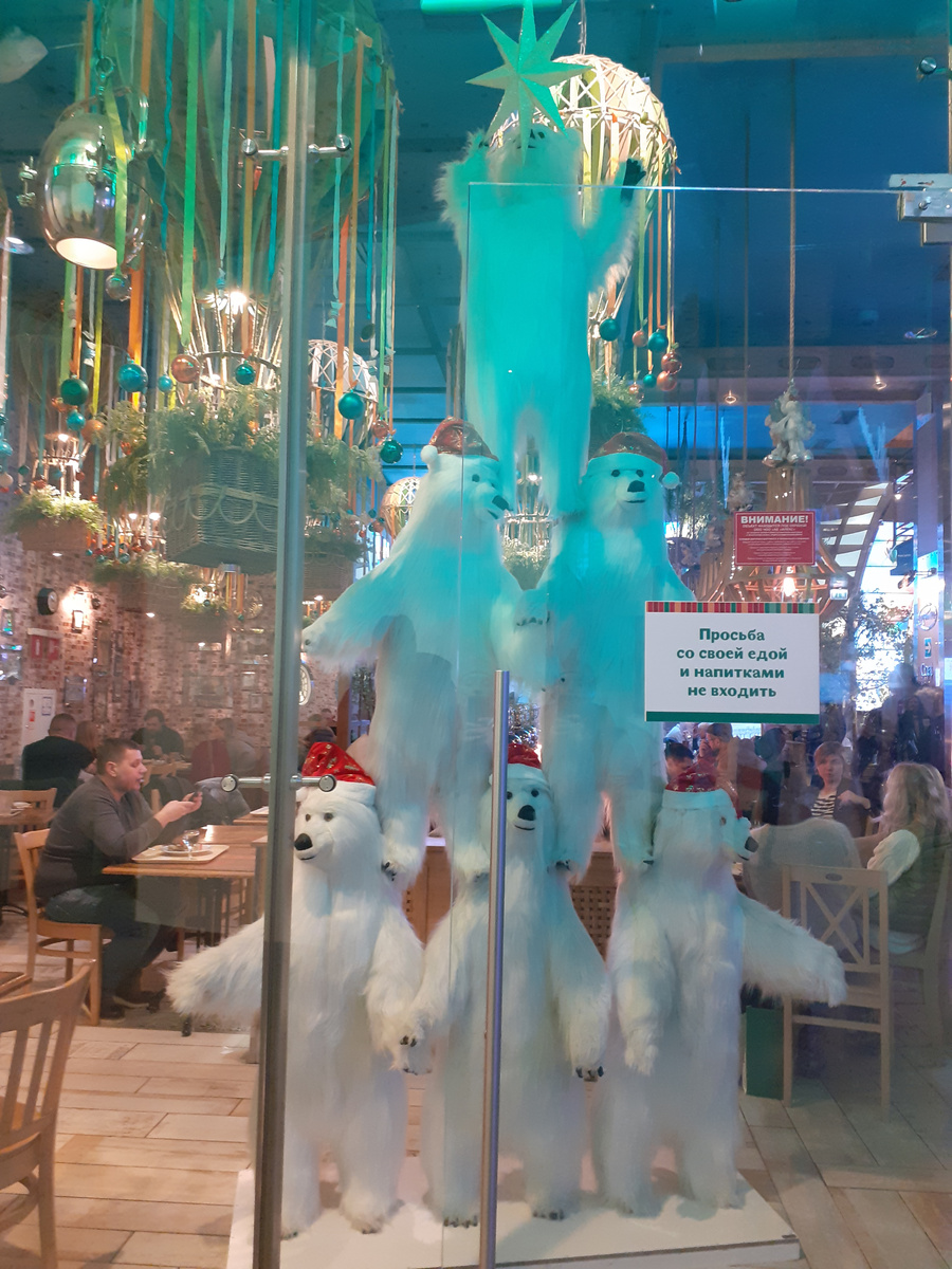 Итак, выхожу из лифта. Первое, что я вижу - это шесть новогодних приветственных белых мишек с длинной шерстью, похожей больше на йети, как их изображают в своих фантазиях очевидцы встреч. И предупреждающая надпись для любителей халявно посидеть в красивом месте.