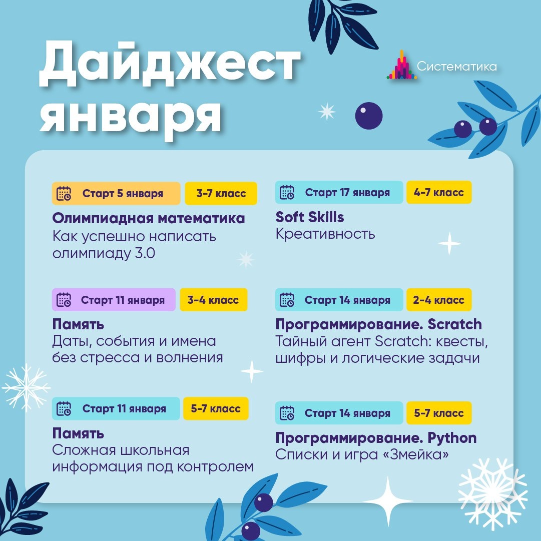 -35% на все курсы вживую! Начинаем год активно! Подготовили для вас так много интересных курсов, что можно что-то случайно пропустить. Чтобы этого не случилось, составили для вас краткий дайджест. ❗️На все курсы вживую до 13 января действует скидка 35% ОЛИМПИАДНАЯ МАТЕМАТИКА «Как успешно написать олимпиаду 3.0» БЕСПЛАТНО 👉Старт 5 января 👉Для учеников 3-7 классов 👉Зарегистрироваться Разберём важные советы и лайфхаки, как писать олимпиаду по математике. Расширенная версия! Будет полезно и интересно и тем, кто проходил предыдущие версии! ПАМЯТЬ «Даты, события и имена без стресса и волнения» 👉Старт 11 января 👉Для учеников 3-4 классов 👉Зарегистрироваться Освоим графические методы запоминания: превратим цифры в картинки, сложные слова в схемы, а даты в яркие образы. Научимся легко запоминать таблицы, даты и правила без скучной зубрёжки. ПАМЯТЬ «Сложная школьная информация под контролем» 👉Старт 11 января 👉Для учеников 5-7 классов 👉Зарегистрироваться Освоим техники эффективно