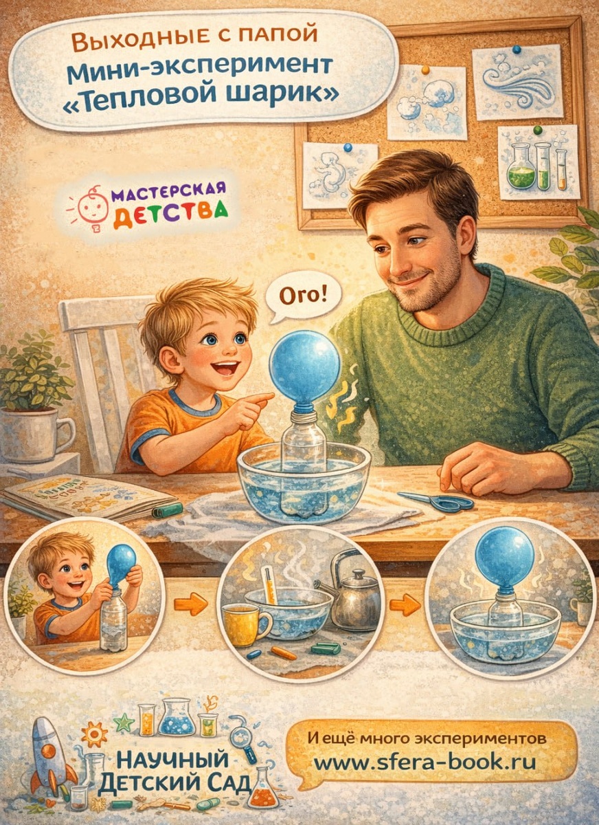 Мини-эксперимент «Тепловой шарик» Если хочется удивить ребёнка и провести время вместе не за экраном - попробуйте простой научный эксперимент. 🎈 «Тепловой шарик» Вам понадобятся: пустая бутылка и воздушный шарик. Наденьте шарик на горлышко бутылки и поставьте её в тёплую воду. Через несколько секунд шарик сам начнёт надуваться. 💡 Что происходит? Тёплый воздух расширяется и поднимается вверх. Для ребёнка это выглядит как магия, а для папы - отличный повод объяснить, как работает мир простыми словами. Почему такие эксперименты особенно хороши: — всё делается быстро и без подготовки — ребёнок видит результат сразу — появляется интерес задавать вопросы и пробовать ещё 🔬 Если хочется больше таких идей, у издательства «Творческий Центр СФЕРА» есть серия «Научный детский сад» с простыми, наглядными экспериментами для детей, которые легко повторить дома или в группе. #МастерскаяДетства