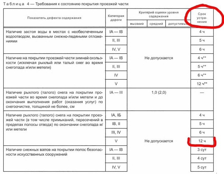 : Проселочные дороги с асфальтобетонным покрытием с интенсивностью движения менее 1500 автомобилей/сутки, а также с покрытиями переходного и низшего типа (грунтовые, щебеночные, гравийные) убираются в течение 2-3 суток после окончания снегопада, в зависимости от его интенсивности. ГОСТ Р 59434-2021: На дорогах V категории - не более 12 часов после снегопада Беззаконие во всём, придумывают себе свои правила не стесняясь. Что с тросами, что с уборкой снега...