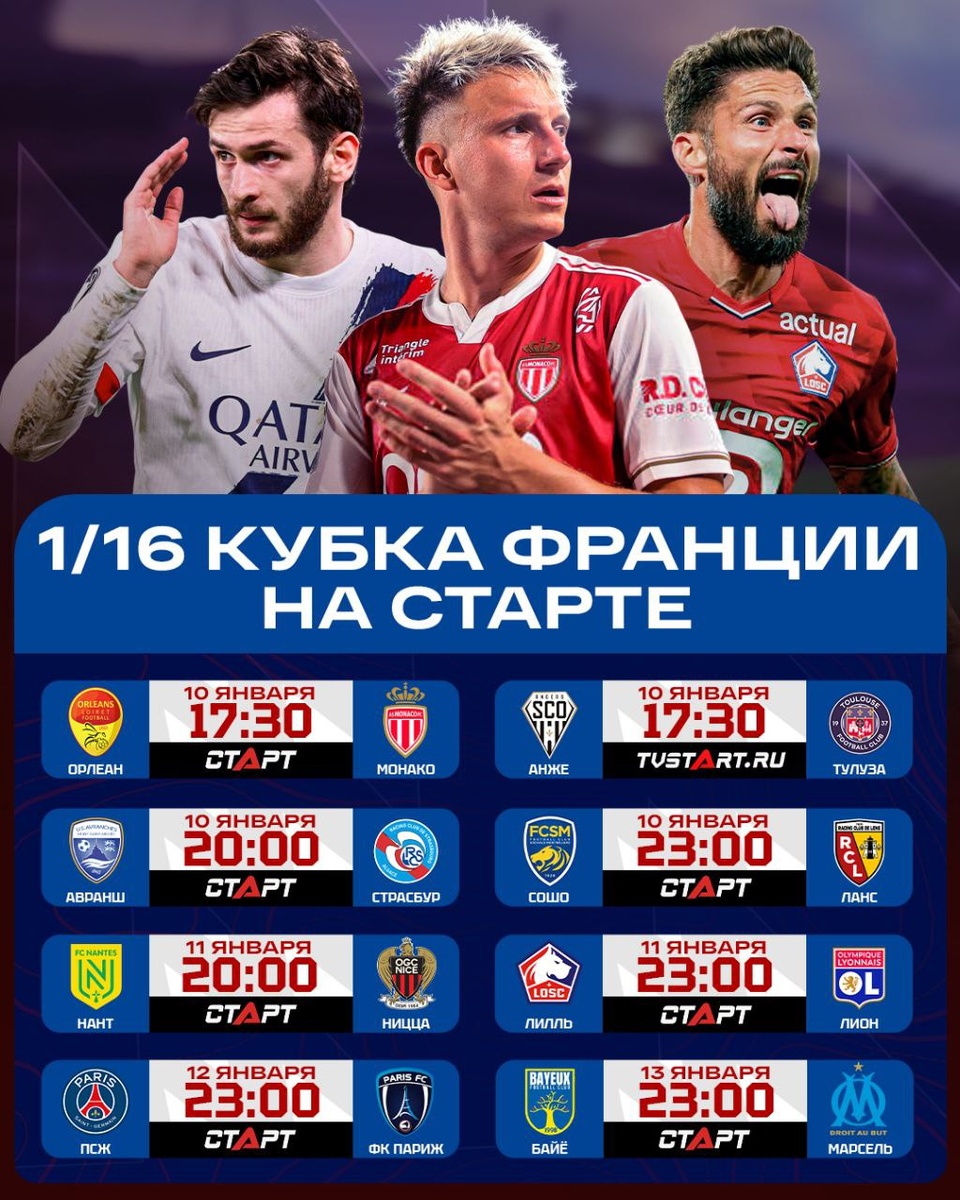 ! На этой стадии нас ждет сразу четыре противостояния команд Лиги 1. Здесь выделяются вывески «Лилль» – «Лион», «Ницца» – «Нант» и, конечно, парижское дерби. Также «Монако» Александра Головина поедет в гости к «Орлеану» из третьей лиги, а «Марсель» Мэйсона Гринвуда попробует выместить злость после поражения в Суперкубке на скромном «Байё». «Страсбур» сыграет с главной сенсацией предыдущего раунда, «Авраншем», а «Ланс» ожидает встреча с двукратным обладателем Кубка Франции – «Сошо». Наслаждаемся французским футболом на телеканалах «Старт» и платформе TVSTART.RU 🖥 🛒 Наше приложение в Google Play 💙 Наше приложение в RuStore 🛒 Наше приложение в App Store