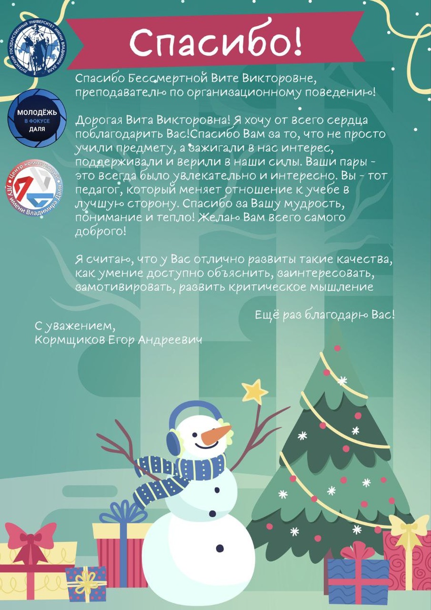 ! Сегодня студенты решили поздравить этих преподавателей: 〰️ Бессмертная Вита Викторовна; 〰️ Жевакин Валентин Сергеевич; 〰️ Курохтин Никита Николаевич; 〰️ Шутова Лилия Ивановна; 〰️ Недобега Анна Аркадьевна. Следите за нашими обновлениями, чтобы увидеть ещё больше приятных слов благодарностей! 🎀 🤩 Молодёжка также уже ждёт вас на RUTUBE и Дзен, подписывайтесь!