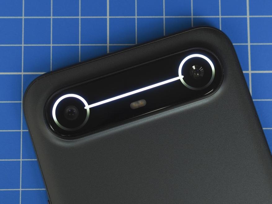 Ещё одна дизайнерская фишка запрятана в блоке камер — это светодиодный индикатор в виде своеобразной мордочки робота. Он умеет оповещать о звонках, показывать степень зарядки и просто мило светиться по нажатию кнопки. Снизу расположены разъём USB Type-C, микрофон, динамик и слот для двух NanoSIM; сверху находятся дополнительный микрофон и вывод для второго динамика; справа можно увидеть стандартный набор кнопок; левый торец пустует. Спрятанный под экраном сканер отпечатков работает быстро, но запускается далеко не сразу: нужно или тапнуть на экран, или какое-то время подержать палец на сканере. Это очень неудобно!