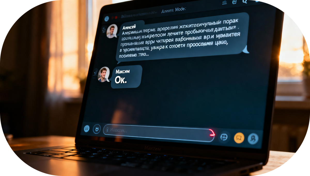 Это было в четверг, в 19:30. Я засиделся на работе, чтобы доделать важное ТЗ для нашего подрядчика, Максима. Я вложил туда кучу мыслей, подробно расписал каждый пункт. Отправил. Ждал. Через пять минут пришёл ответ: