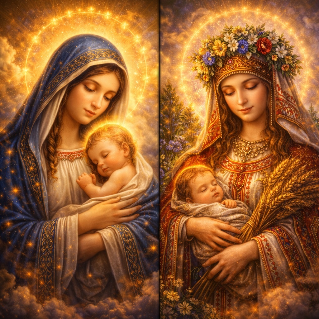 Есть сходства, которые можно списать на случайность. А есть такие, от которых хочется отвернуться — слишком уж они наглядны. Образ Девы Марии и образ Макоши относятся ко второй категории. Их сходство не косметическое, не «в духе времени», а структурное. И именно поэтому разговор о нём десятилетиями старались уводить в сторону, оборачивать благочестивыми формулами или вовсе замалчивать.