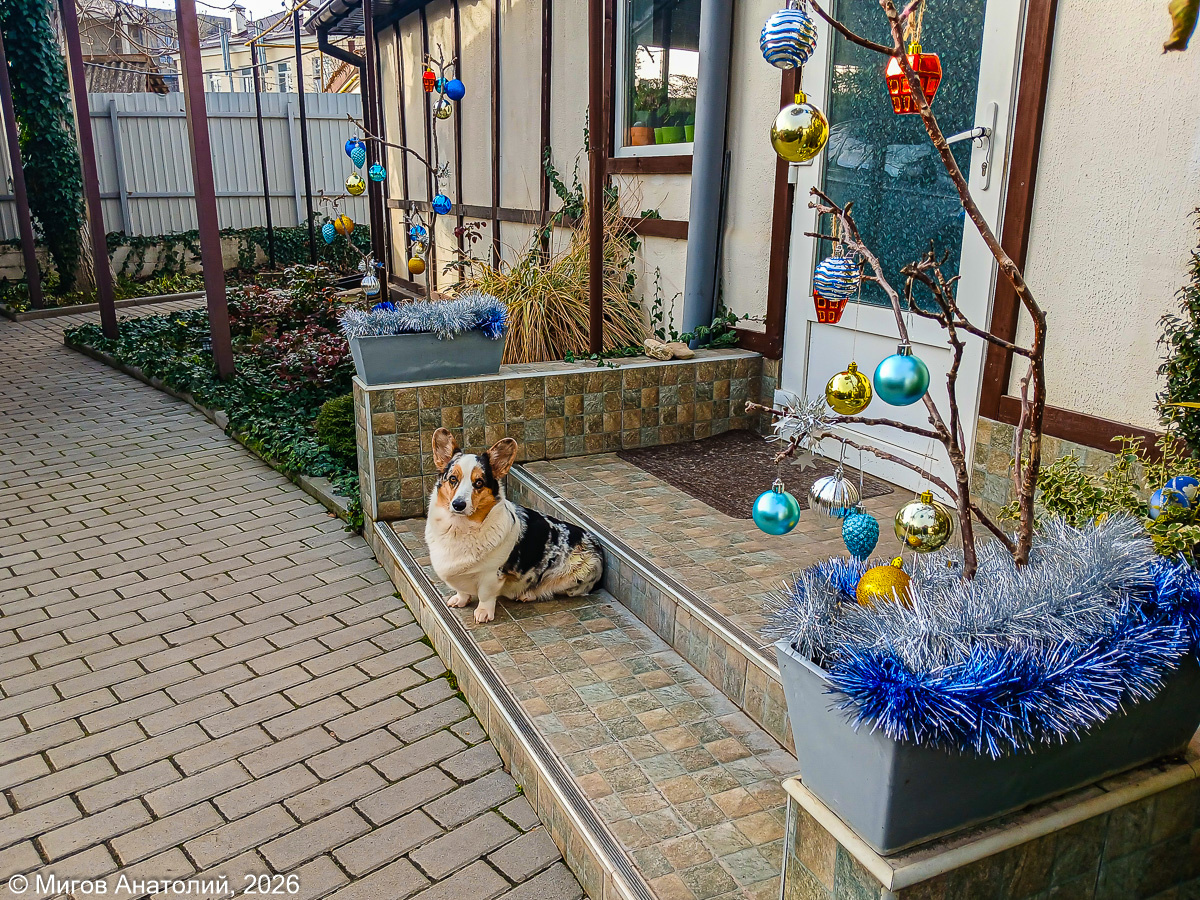 В Старом Крыму пока ещё солнце. Появляется из-за туч и снова прячется. Такого тепла, как было на Рождество, когда мы чаевничали на открытой террасе, уже нет. Так что, открыли сезон завтраков и обедов под небом голубым, и снова перебрались в дом. Наши усатая и хвостатая компания вовсю радуется тёплыми январскими деньками и с удовольствием проводит время на улице. Корги Тильда задумчиво бродит по дорожкам, в надежде найти что-нибудь съедобное. Кошка Маруся собралась перекусить зелёными стеблями травы. Осторожная Кокошка, забравшаяся на старую грушу, собралась спуститься на землю, но сначала осматривается по сторонам. Такая уж у неё фишка. Живет всю свою жизнь в доме, ни разу за пределы участка не выходила, но всё время чего-то опасается. Может быть, бабушка Маруся, которая активно принимала участие в воспитании всех наших котят, запугала внучку рассказами о опасностях, ожидающих юную девицу за пределами дома. Пока Кокошка выбирает безопасные пути спуска с дерева, внизу её поджидает мам