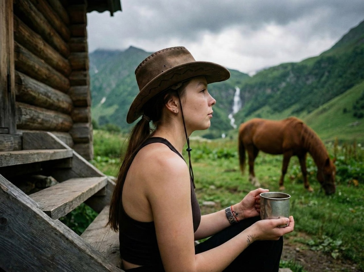 🔠🔠🔠🔠🔠🔠🔠 👸 Серия плёночных снимков "С лошадкой" 5 из 5 Промт умеет брать референсы вашего кота из фото) 👉Генерирую тут Use the uploaded photo to reference your face and appearance. Keeping the facial features and not changing. Keep 100% similarity. Woman sitting on the wooden steps of a rustic cabin, cowboy hat, low ponytail, bare shoulders, holding a vintage tin cup of coffee, looking thoughtfully into the distance. Foreground: Worn wood texture of the steps. Background: A brown horse grazing in the lush grass, green mountain landscape, waterfall in the distance, cloudy sky. Style & Atmosphere: Photorealistic, cinematic shot, shallow depth of field, bokeh background, rustic western aesthetic, moody natural lighting, cloudy day, high detail, 8k resolution, raw style. Colors: Earth tones, sage green, metallic grey, skin tones, horse chestnut brown. --ar 4:5 --v 6.0 Shot on Lomo LC-A witch Fujicolor C200 Заказать промт или фотосессию. ✉️ Буст канала. ⚡️ Чат где кр