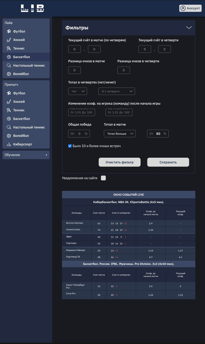 Данная стратегия заключается в поиске матчей лайве, где предлагаемый текущий тотал букмекером в LIVE был "Больше". Для этого заходим на сайт https://lib.bet/, регистрируемся, приобретаем подписку, затем переходим в раздел "Лайв" и выбираем "Баскетбол" и находим матчи "Кибербаскетбол". Далее настраиваем фильтры, указываем интересующий нас процент, нажимаем кнопку "Сохранить". Затем сканер выдает нам матчи соответствующие нашим настройкам фильтров. То есть сайт выдал матчи в которых текущий тотал (в лайве) в 80% и более случаев был Больше! Во вкладке "Статистика H2H" видно, что в 10 последних очных встречах этих команд текущий тотал 127.5 был выше в 100% случаях, при этом средний показатель очных встреч этих двух команд составляет 138,8. В таком случае по логике вещей выгоднее будет сделать ставку на тотал больше 127.5, так как это является более вероятным исходом события. Матч завершился с тоталом 141 Сканер LIB -https://lib.bet/ Данная стратегия заключается в поиске матчей лайве,