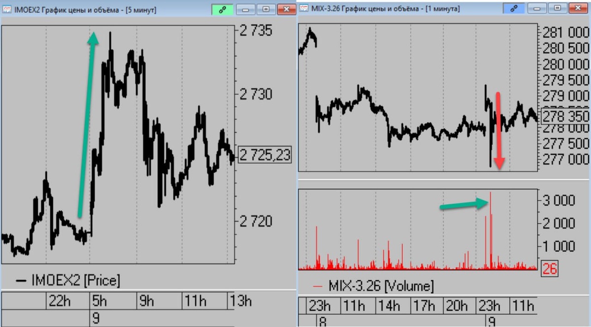 ◼️ Слева индекс Московской биржи. Открываемся ростом, идём наверх. ◼️ Справа фьючерс на индекс, вливаетя почти по миллиарду рублей в продажу фьючерса в минуту прямо на этом росте, соответственно он вообще падает. ну а потом врубаются роботы уже на споте и начинается давление. "Когда хвост рулит собакой" (с)