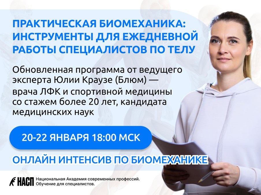Специалистам по телу, ЛФК, тренерам, реабилитологам, массажистам — знакома ли вам ситуация, когда клиент вроде бы делает «всё правильно», но прогресс идет медленно или не держится? Причина может быть в отсутствии системного подхода к диагностике и построению тренировочной программы. Решить эту задачу можно за 3 дня — на интенсиве по практической биомеханике от Юлии Краузе (Блюм), врача ЛФК, кандидата медицинских наук, реабилитолога с 20+ летним опытом. Когда: 20–22 января 2026