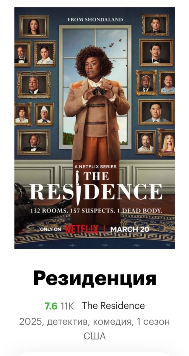 Резиденция 2025 г Я не претендую на роль кинематографического критика, или на роль человека с прекрасным вкусом, я просто очень люблю детективы...с тех пор как с бабушкой наперегонки угадывали убийцу, читая по 1 главе Агаты Кристи....так о чем я... . Недавно меня увлёк достаточно новый, но очень рейтинговый сериал " Резиденция"- как- то пропустила его ...и сразу "зацепила” главная героиня ( полицейский)..
