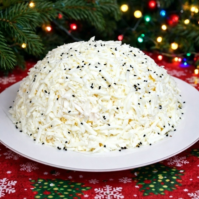 9. Белки натереть на крупной тёрке, равномерно посыпать салат, аккуратно прижать, чтобы получился «снежный» эффект.