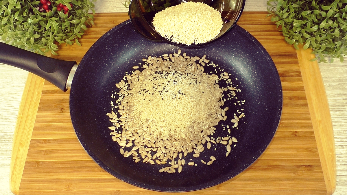 Обжаривайте на среднем огне, постоянно помешивая лопаткой. Семена подсолнечника должны приобрести слегка золотистый оттенок, а кунжут – слегка подрумяниться.