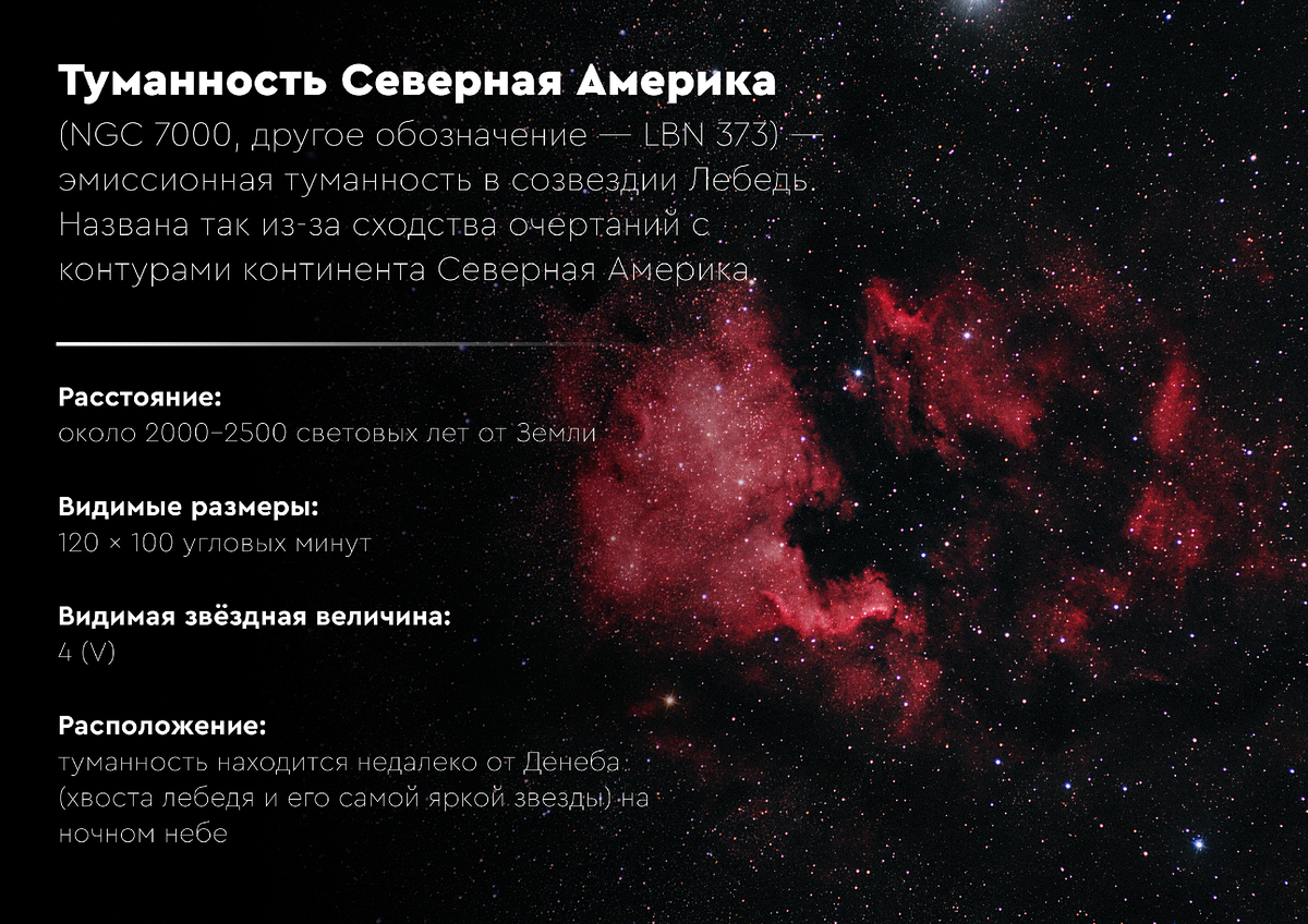 Вот что действительно интересно. Долгое время астрономы считали, что Северная Америка и расположенная рядом, буквально в облаке-соседе, туманность Пеликан — два отдельных объекта. Разделяла их (и делит до сих пор) непрозрачная полоса холодной космической пыли — огромный межзвёздный «занавес».