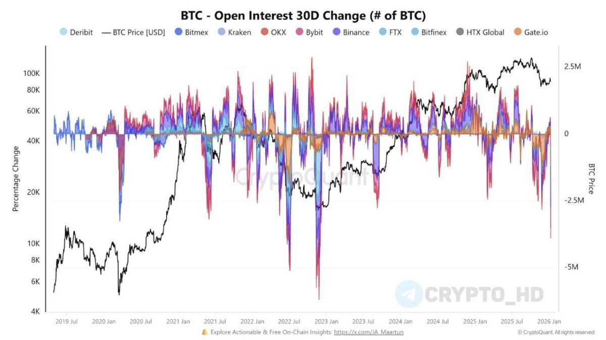 👇 CryptoQuant: Открытый интерес во фьючерсах на Биткоин – минимум с 2022 года! Открытый интерес (OI) – это суммарное количество всех действующих фьючерсных контрактов на актив. Снижение OI указывает на сокращение позиций и частичный вывод капитала с деривативного рынка. Подобная динамика может говорить о фазе охлаждения после повышенной активности и нередко предшествует периоду стабилизации или формированию нового тренда. Cryptо Headlines