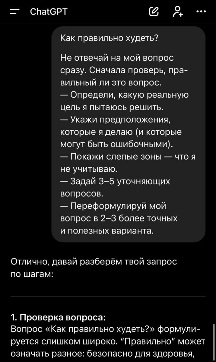 поймёт, чего вы на самом деле хотите. Используем так: [Ваш вопрос] Не отвечай на мой вопрос сразу. Сначала проверь, правильный ли это вопрос. — Определи, какую реальную цель я пытаюсь решить. — Укажи предположения, которые я делаю (и которые могут быть ошибочными). — Покажи слепые зоны — что я не учитываю. — Задай 3–5 уточняющих вопросов. — Переформулируй мой вопрос в 2–3 более точных и полезных варианта. Сохраняем. CtrlAltDelights- подписаться