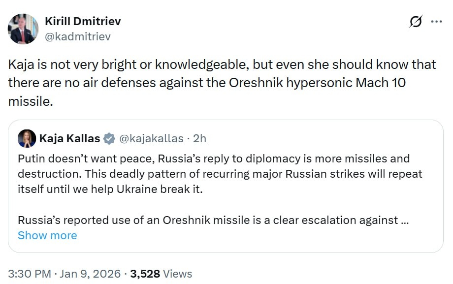 Dmitriev surprised that even 'not very bright' Kallas doesn't know 'there are no air defenses' against Russia's Oreshnik