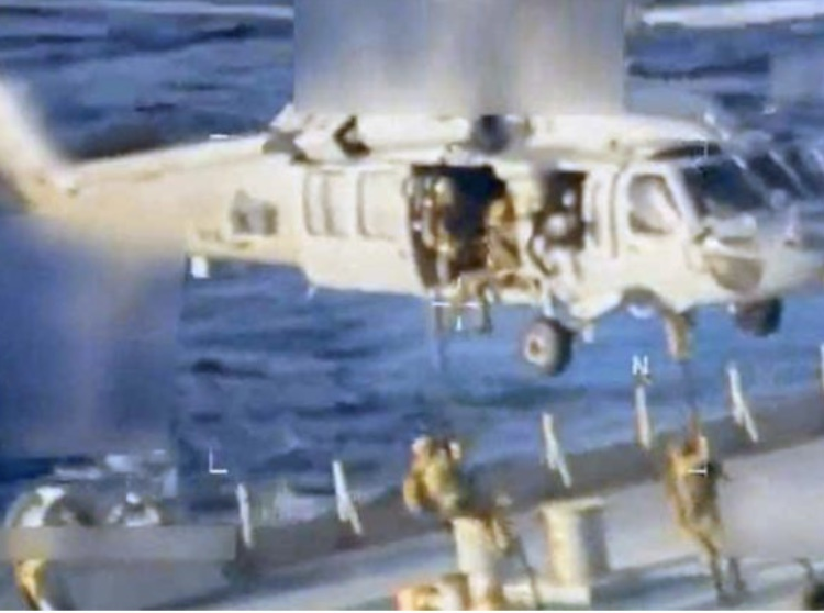 Предположим, в регионе действительно проводили учения или транзит российские корабли. Увидев, что американцы задерживают частное судно под сомнительным флагом за нарушение своих внутренних санкций (не резолюций ООН!), командование российского отряда что делает? Начинает войну? Нет. Оно действует строго в рамках международного права.