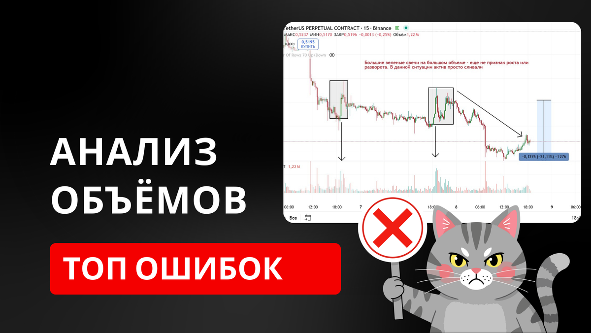 Смотришь на объемы, а сделки все равно в минус? Видишь всплеск на гистограмме, заходишь - и получаешь вынос? Проблема не в том, что объемы не работают. Проблема в том, что ты их читаешь неправильно. Объем - это единственное, что не врет на рынке. Цена может рисовать что угодно, индикаторы могут запаздывать, а объем показывает реальные деньги. Но большинство трейдеров используют его как украшение графика. Сейчас разберем, где ты теряешь профит. Видишь большой зеленый столбик - думаешь, покупай. Видишь красный - продавай. Это самая примитивная ошибка, которая сливает депозиты пачками. Объем без контекста - пустой звук. Важно не сколько, а где и как. Большой объем на пробое уровня - одно. Большой объем внутри флета - совсем другое. Большой объем на откате в тренде - третье. Рис. 1 Крупняк может специально вливать объем, чтобы сбросить позицию толпе. Ты видишь активность, заходишь вслед, а цена разворачивается. Потому что умные деньги уже вышли, а тебе продали свои активы по выгодной им це