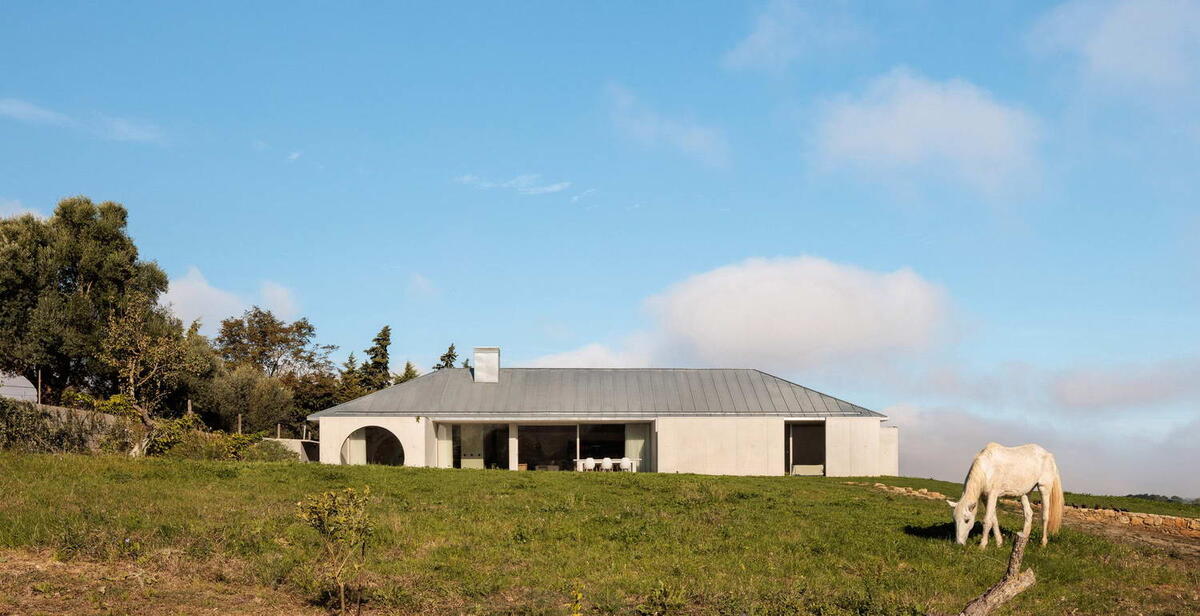 Этот простой и одновременно неожиданный бетонный дом построен в уединённом месте в португальском национальном природном парке Аррабида. Одноэтажный дом должен обеспечить «ощущение одновременно уединения и открытости». Основная концепция дома — это, казалось бы, независимые отношения между открытыми бетонными стенами и четырёхскатной крышей, которая на них опирается, а также то, как это создаёт тонкую связь между интерьером и экстерьером. Проект создаёт ощущение как уединения, так и открытости, гарантируя приватность как со стороны улицы на севере, так и со стороны прилегающего участка на западе. Компания Cimbre разместила дом на вершине холма, чтобы обеспечить оптимальные виды на окружающие горные хребты. Задний фасад, обращённый на юг, имеет большие застеклённые проёмы, а ряд полузакрытых дворовых пространств образуют более приватные площади, которые студия описывает как «открытые зоны с разной степенью интимности». Нарушая планировку правильной формы, к спальням и ванным комнатам б
