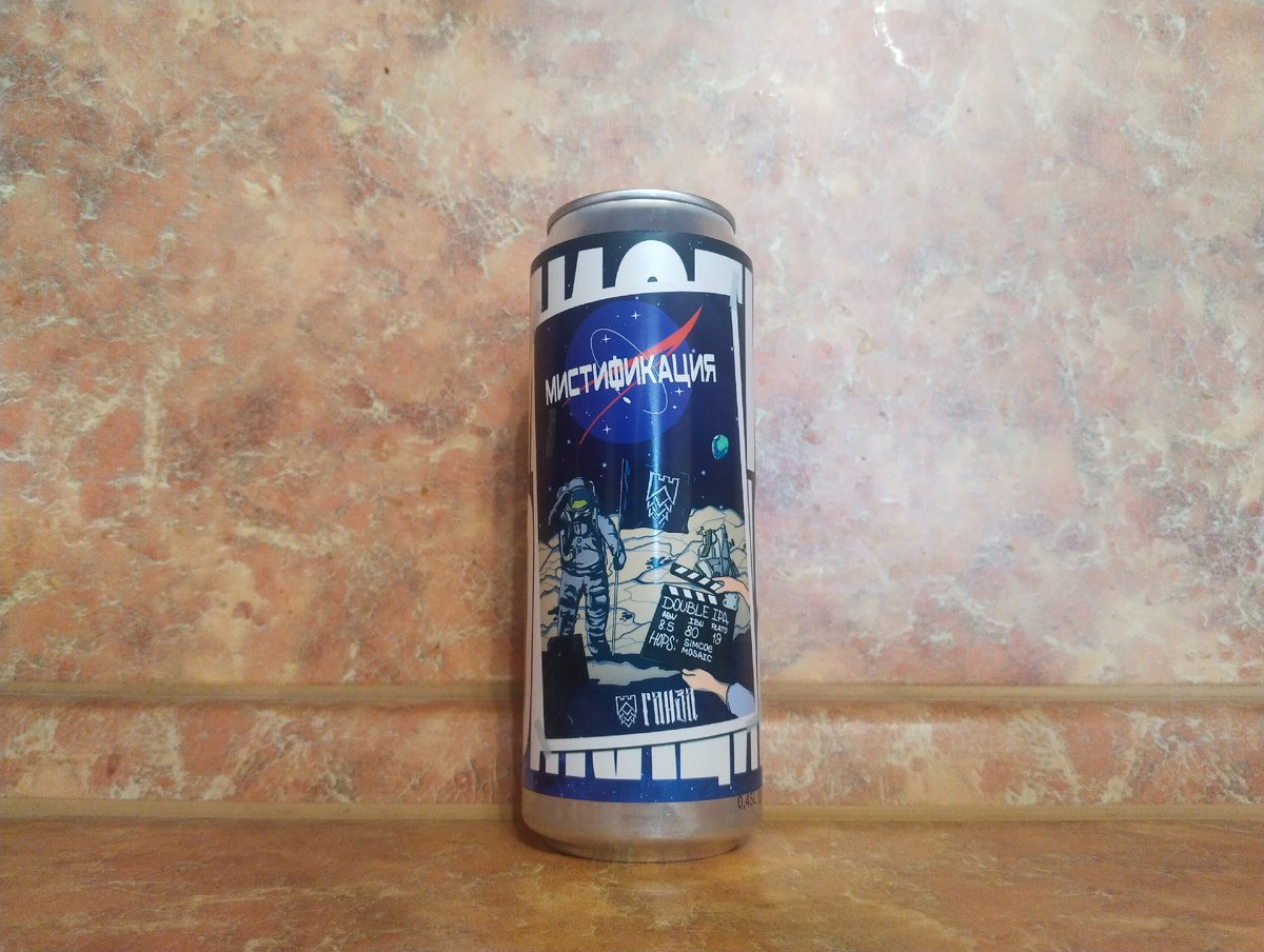 Этикетка у пивка очень весёлая и позитивная - обыгрывает высадку американцев на Луне в комическом стиле - мол, в павильонах снималось и всё это неправда. Но мы не будем вдаваться в подробности космических свершений той или иной страны, а просто припьём новиночку - DIPA Мистификация от пивоварни Ганза! Алкашка/плотность - 8.5%/19%. IBU - 80. Стиль - DIPA. Объём - русская пинта 0.45 л. Цена -