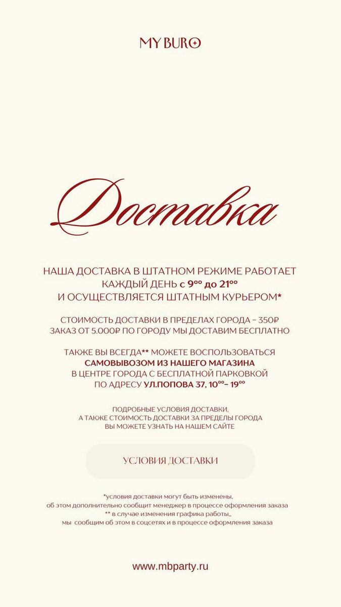 ! Мы привозим заказы каждый день с 09°° до 21°° Стоимость доставки по городу 350₽, а заказы от 5.000₽ мы привозим бесплатно Если вы хотите получить заказ вечером день в день или на утро следующего дня - его необходимо оформить до 18:00 Подробную информацию о режиме доставки и стоимости за пределы города вы сможете найти на нашем сайте А чтобы оформить заказ, просто напишите нам @myburo_shop #myburo_онас@myburo_channel