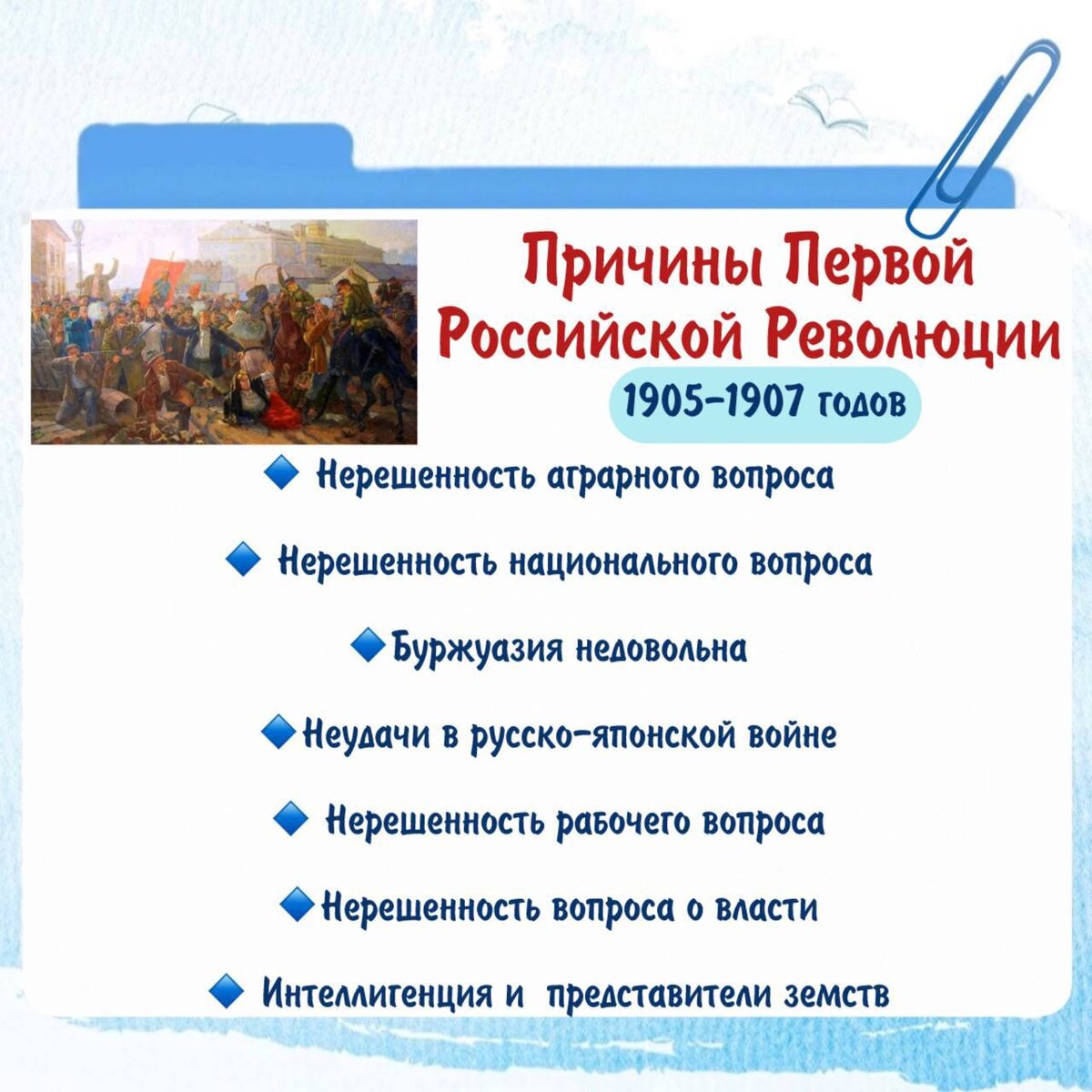 ! Это событие НУЖНО знать каждому! А ещё нужно знать причины Первой Российской Революции👇 🟠Нерешенность аграрного вопроса - крестьянское малоземелье; - сохранение выкупных платежей. 🟠 Нерешенность национального вопроса - недовольство политикой русификации; - ограничение автономии Польши и Финляндии. 🟠Неудачи в русско-японской войне 🟠Нерешенность рабочего вопроса - тяжелые условия труда, длительный рабочий день (в среднем 12 ч); - маленькая заработная плата 🟠Нерешенность вопроса о власти - отсутствие либеральных преобразований в общественной жизни;