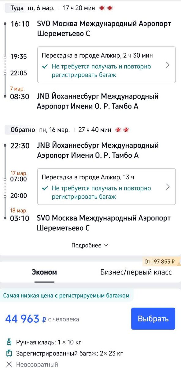! Африка ближе, чем кажется — с одной пересадкой и щедрым багажом. 📅 Даты: 6 – 16 марта (перелет через Алжир) 🛄 Багаж: 2 места по 23 кг + ручная кладь 10 кг ✈️ Авиакомпания: с удобной стыковкой, багаж сквозной Маршрут: ➤ Туда: 16:10 (Москва, SVO) → Алжир (2ч 30м) → 08:30+1 (Йоханнесбург, JNB) ➤ Обратно: 22:30 (JNB) → Алжир (13ч) → 03:10+1 (Москва, SVO) ✨ Йоханнесбург — ворота в Южную Африку. Здесь можно: · Побывать в Соуэто и узнать историю Нельсона Манделы · Отправиться в сафари в заповедник Pilanesberg · Увидеть алмазные шахты и золотые рудники · Поехать к водопаду Виктория или в Кейптаун · Погрузиться в культуру и кухню на рынке Neighbourgoods Market 💰 Цена от 44 963 ₽ на человека в эконом-классе с полным багажом. Подходит для тех, кто хочет Африку с комфортом и без лишних хлопот с перевесами. --- #Йоханнесбург #Африка #Путешествия#Авиабилеты 📢 @turmexanika — ловим хороший тариф с багажом. Цены могут меняться.